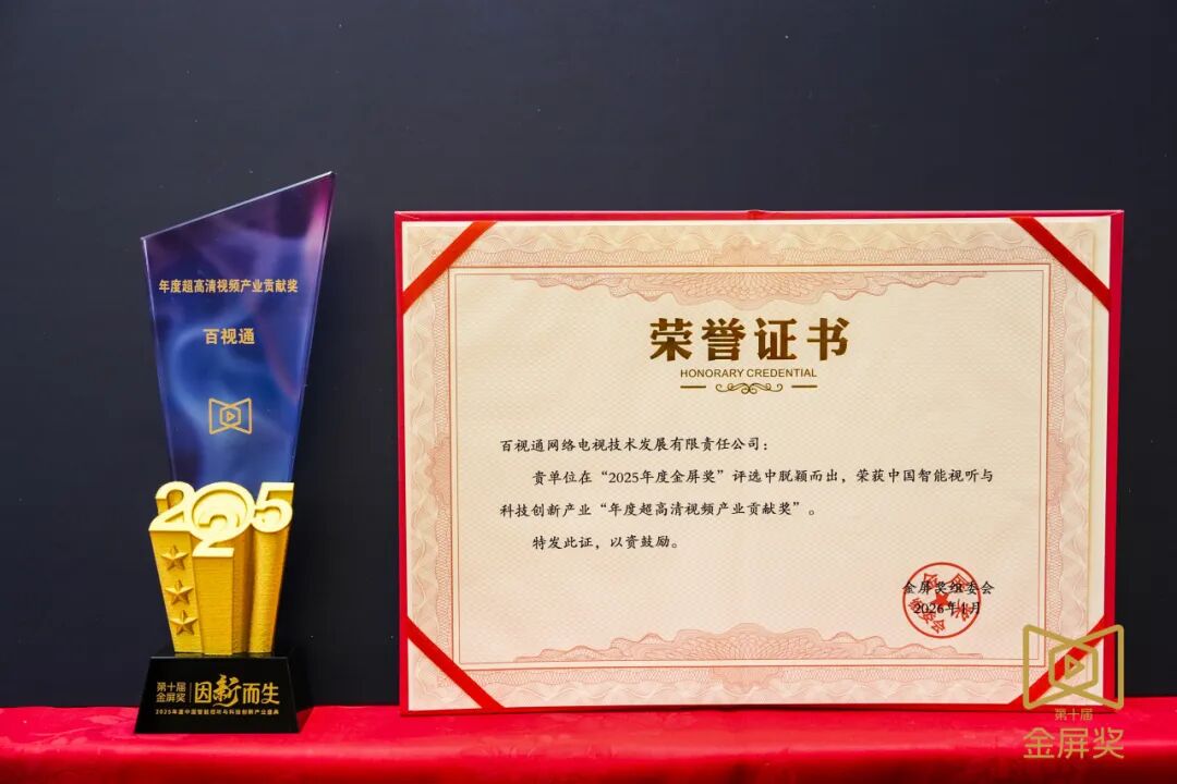此次荣获“年度超高清视频产业贡献奖”,标志着百视通在超高清领域的长期深耕获得行业认可。作为大屏视听领域的领军者,百视通始终以创新为驱动,以技术为基石,不断探索新技术、新产品与新模式。2025年,百视通持续深化超高清技术与产业生态融合,积极推动国产HDR Vivid与Audio Vivid自主音视频标准的规模化落地与生态共建,储备近3000小时超高清内容;在生产变革上,通过全链路技术体系与“文心雕龙AI智创平台”,实现内容生产效率与质量的跃升,驱动内容生产向高清化、智能化转型;在应用拓展上,更以“BesTV上海博物馆”、百视通云游戏等创新实践,将超高清技术从视听享受延伸至文化沉浸、互动娱乐等多元场景,打破传统体验。